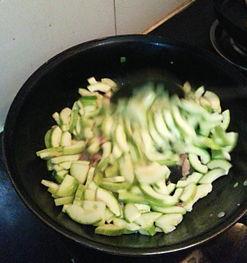 2. 炒角瓜:在锅中留少许油,放入切好的角瓜条,用中火翻炒至角瓜表面微微发黄,这时候可以加入适量的盐调味。